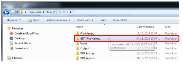 5. On the hard drive of the computer locate the GDT folder (e.g. C:\GDT); in this folder create two more folders named; ‘PDF reports’ and ‘PDF history’