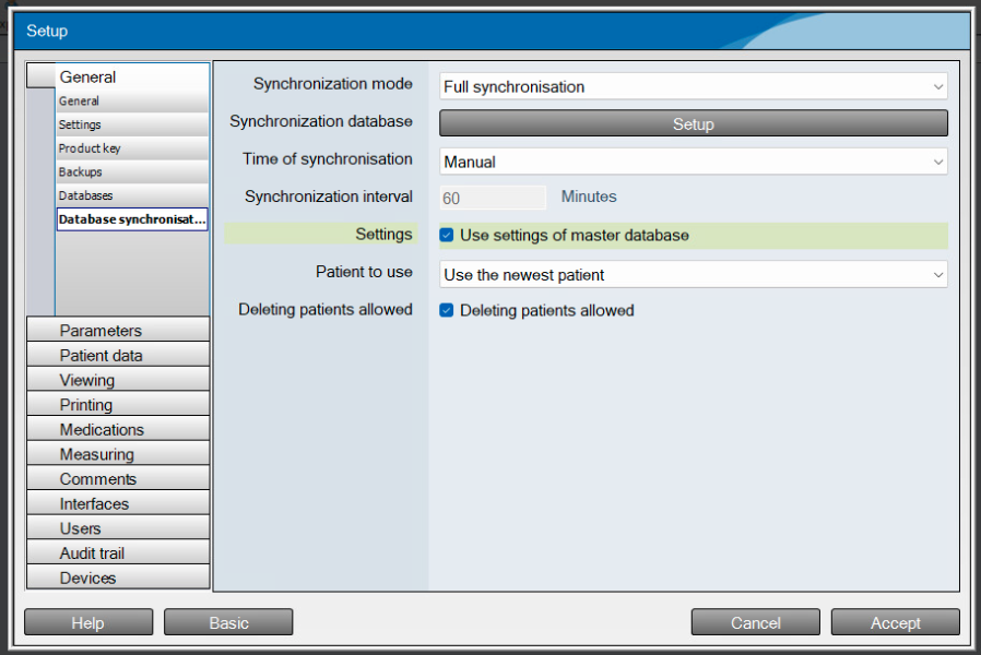 - Click Synchronisation Database, here you will enter the details of your central database server.
