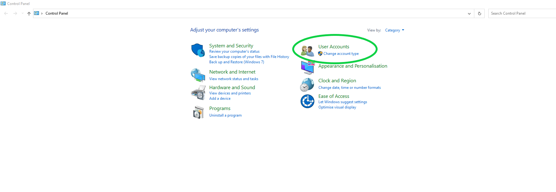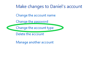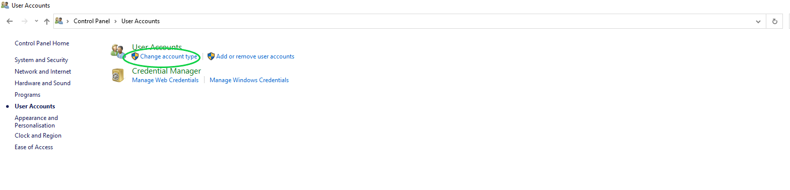 5)Once you have clicked into this you will then need to click on change account type, which is located under user accounts (circled in green).