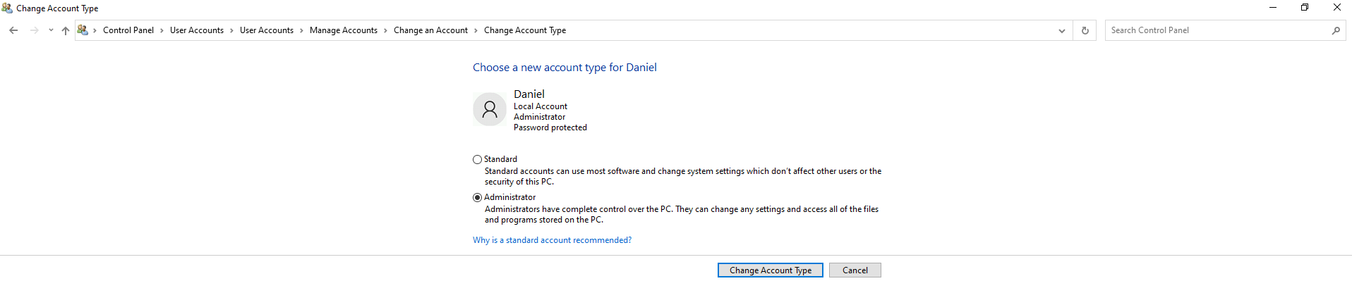 8)After you have clicked into Change account type you will then have the choice to either have a standard account or an Administrator account you need to black circle to be in the Administrator box.